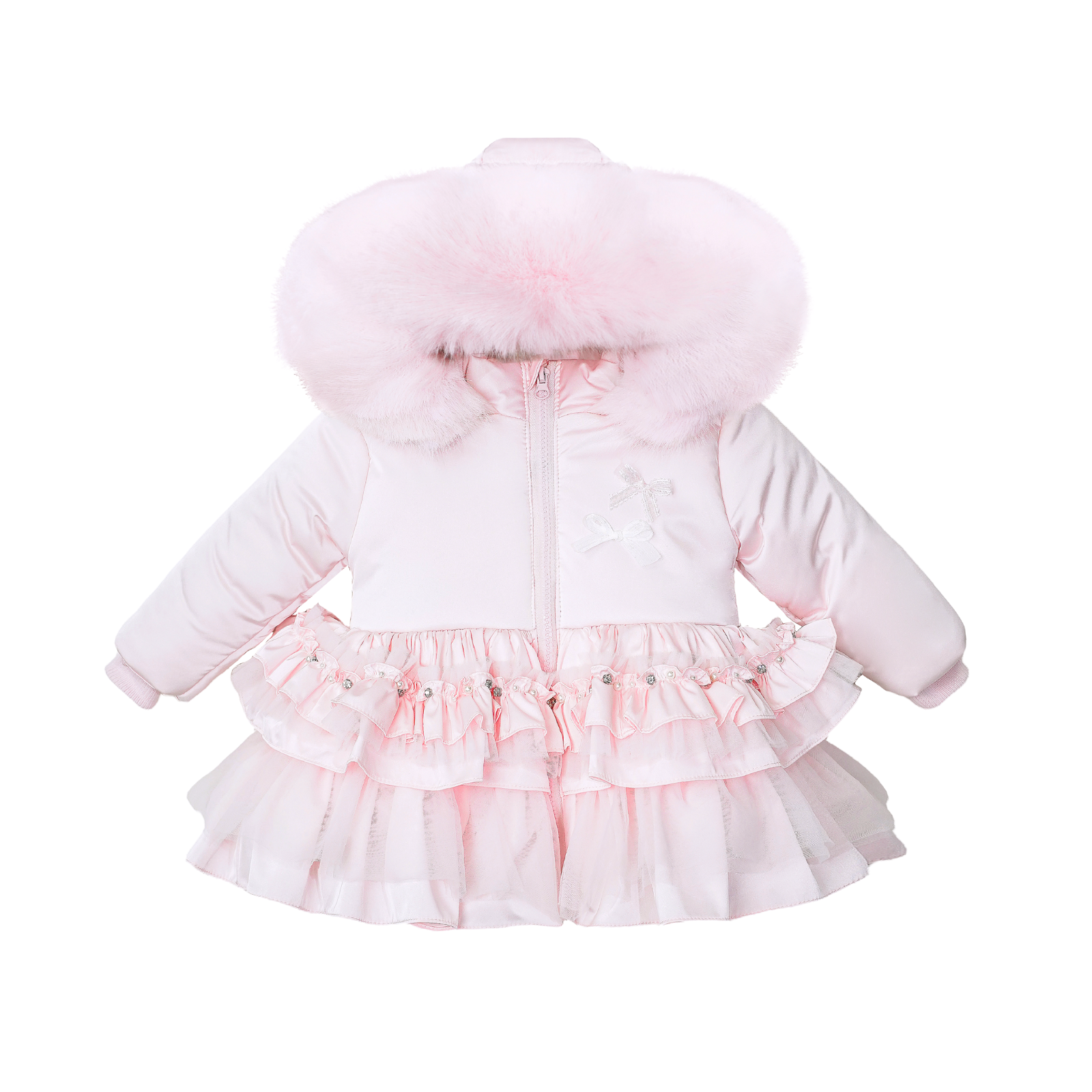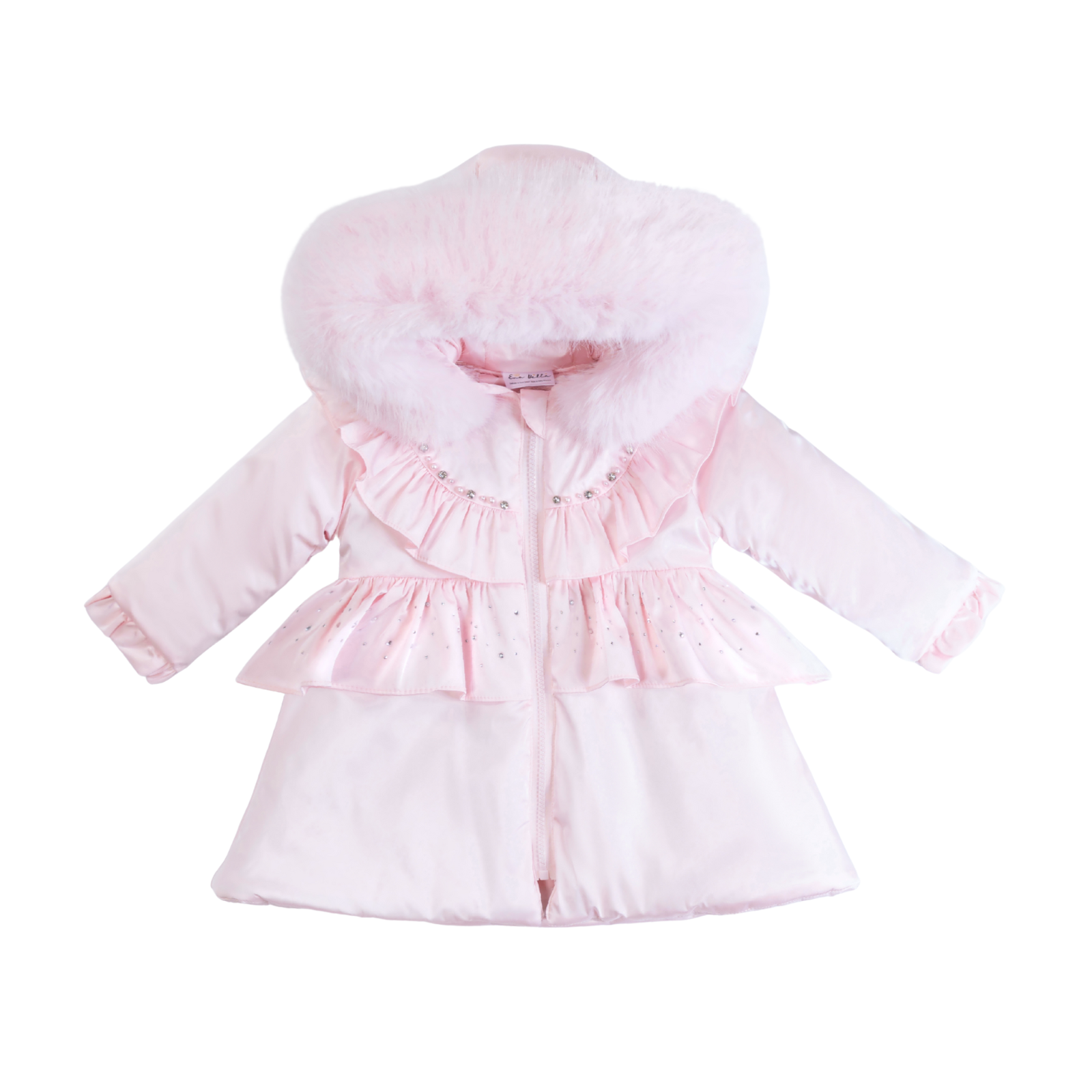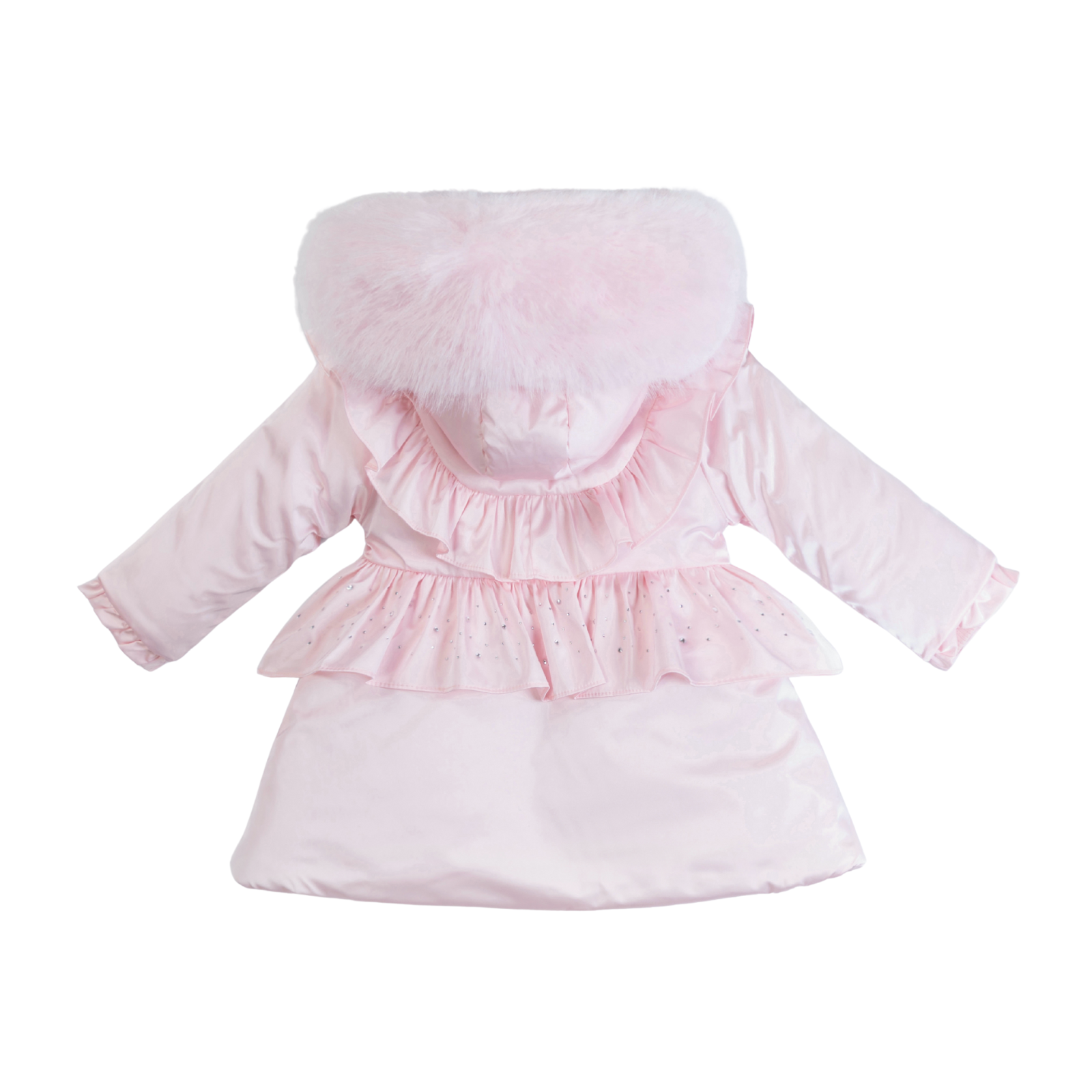 Luxury Baby Girl Baby Pink Puffer Coat with Oversized Faux Fur Hood, Pearl & Diamanté Embellishments, Layered Ruffles – Warm Winter Jacket EvaBella EB-9701-S