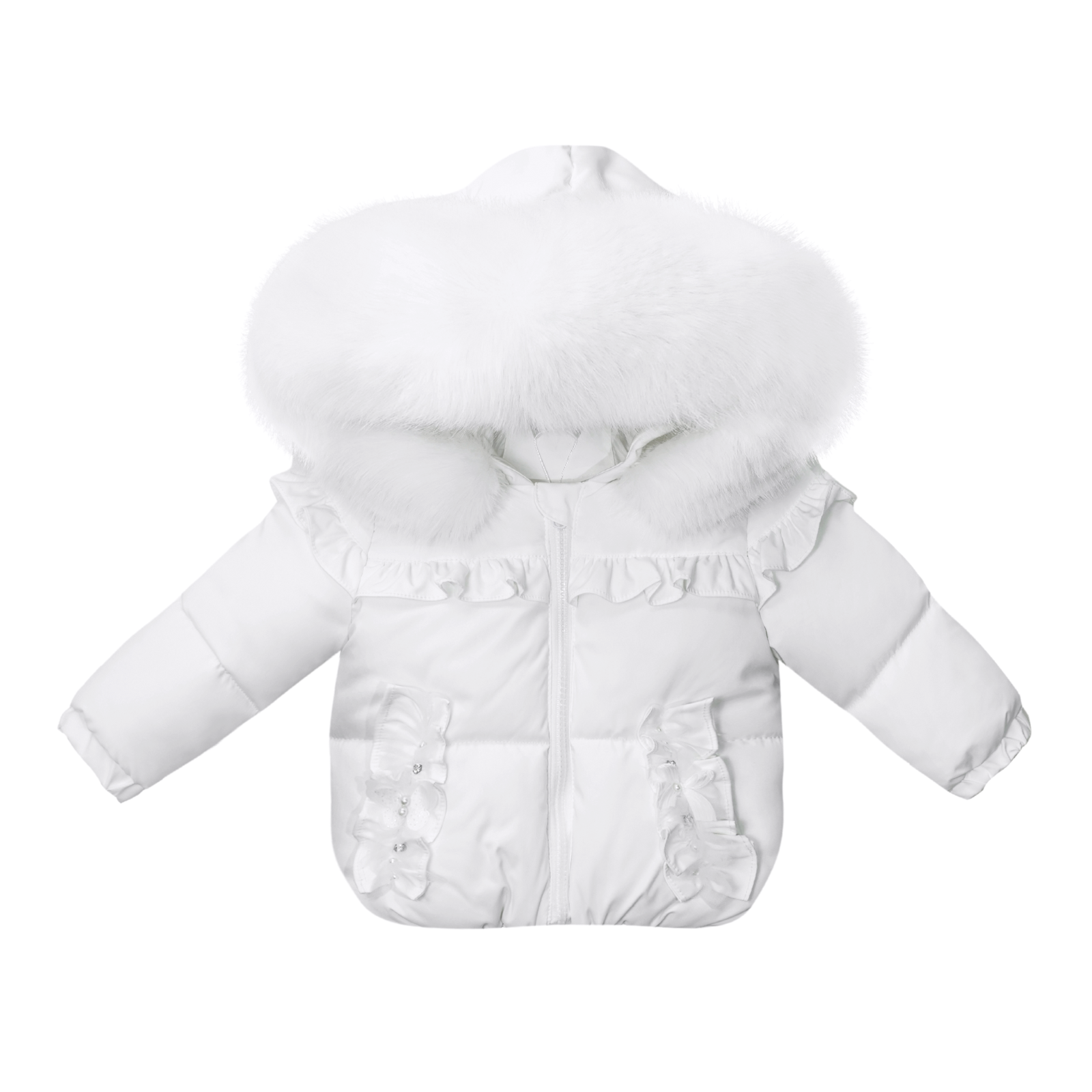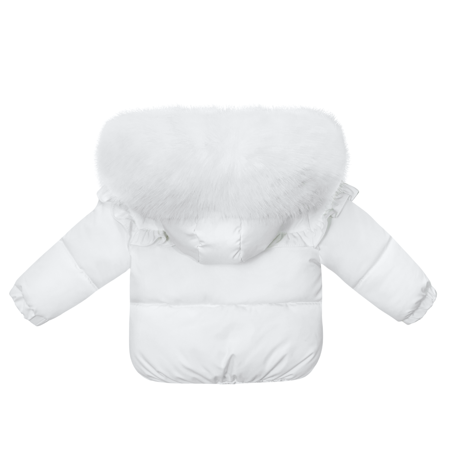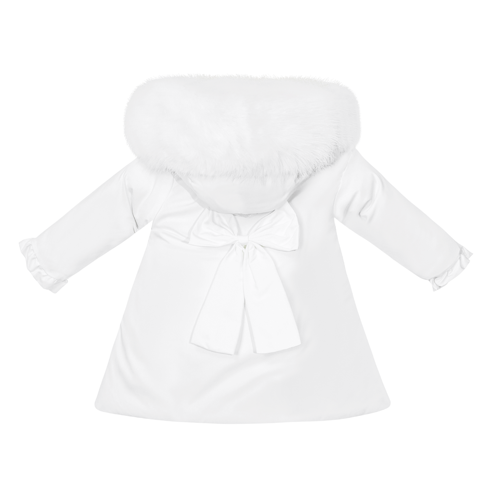 Luxury Baby Girl White Puffer Coat with Oversized Faux Fur Hood, Satin Bow & Diamanté Pocket Details – Warm Winter Jacket EvaBella EB-9702-S