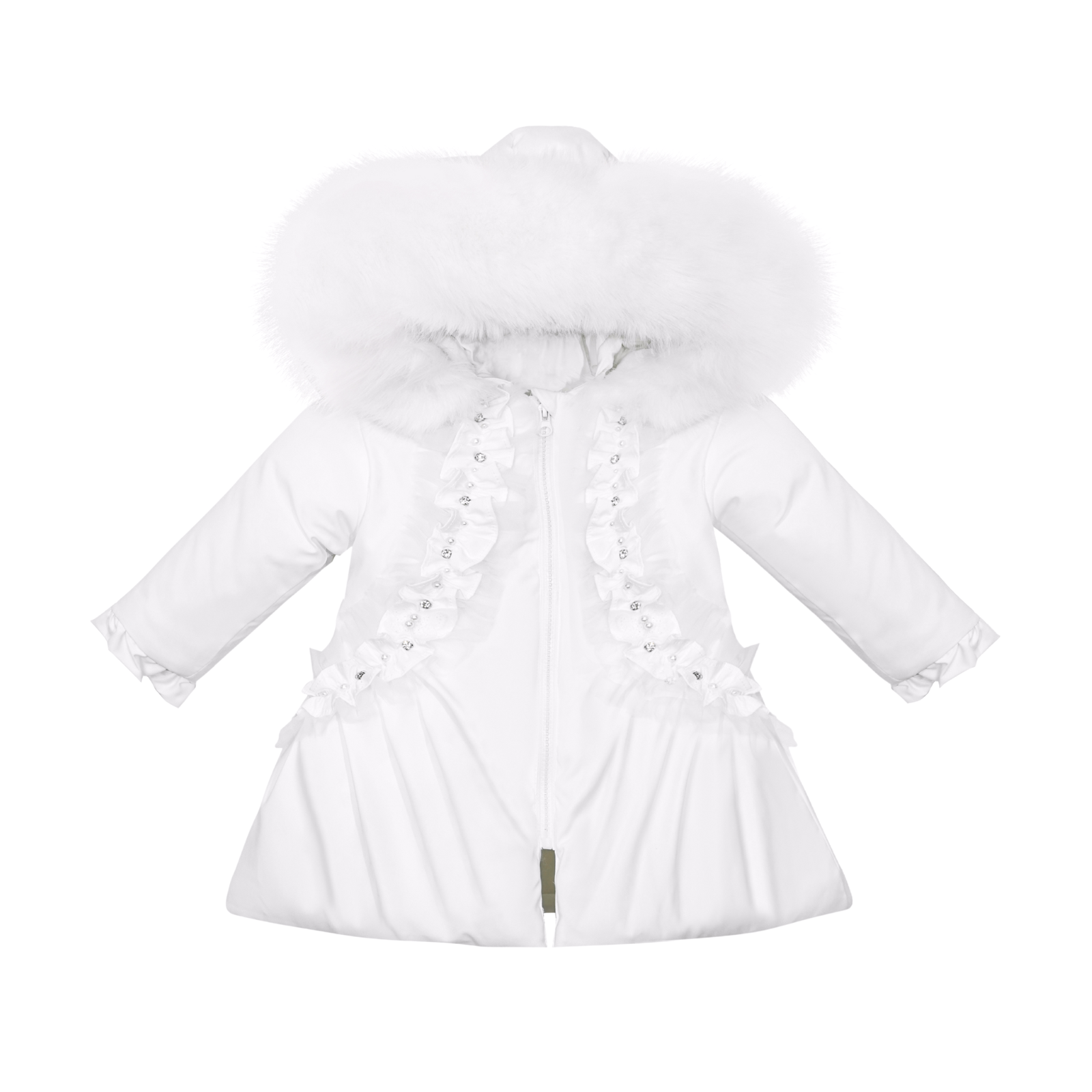 Luxury Baby Girl White Puffer Coat with Oversized Faux Fur Hood, Pearl & Diamanté Embellishments, Tulle Details, and Satin Butterfly Accents – Warm Winter Jacket EvaBella EB-9703-S