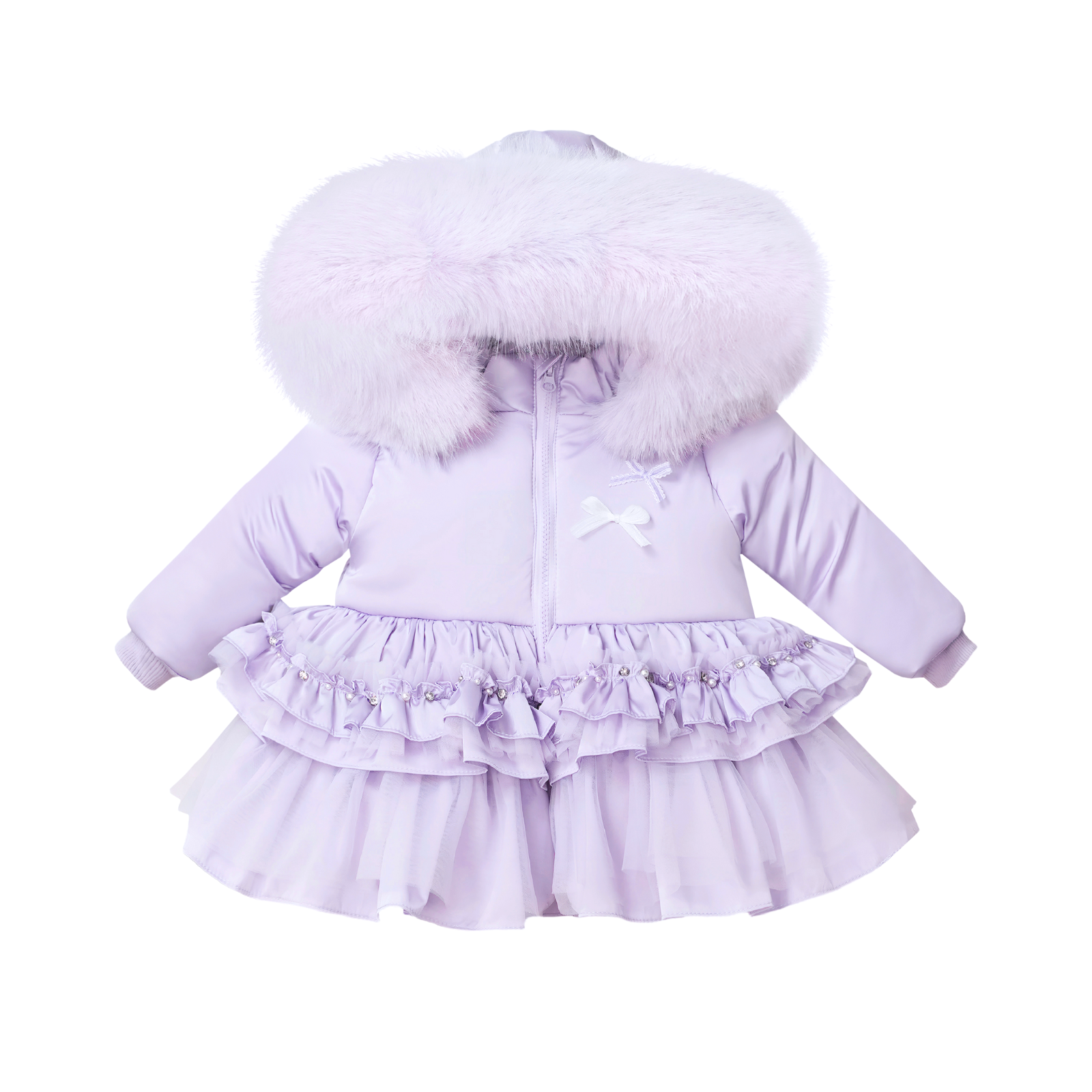Luxury Pastel Lilac Puffer Coat with Oversized Faux Fur Hood, Layered Tulle Skirt & Pearl Diamanté Details – Cozy Winter Jacket for Girls EB-9708-S