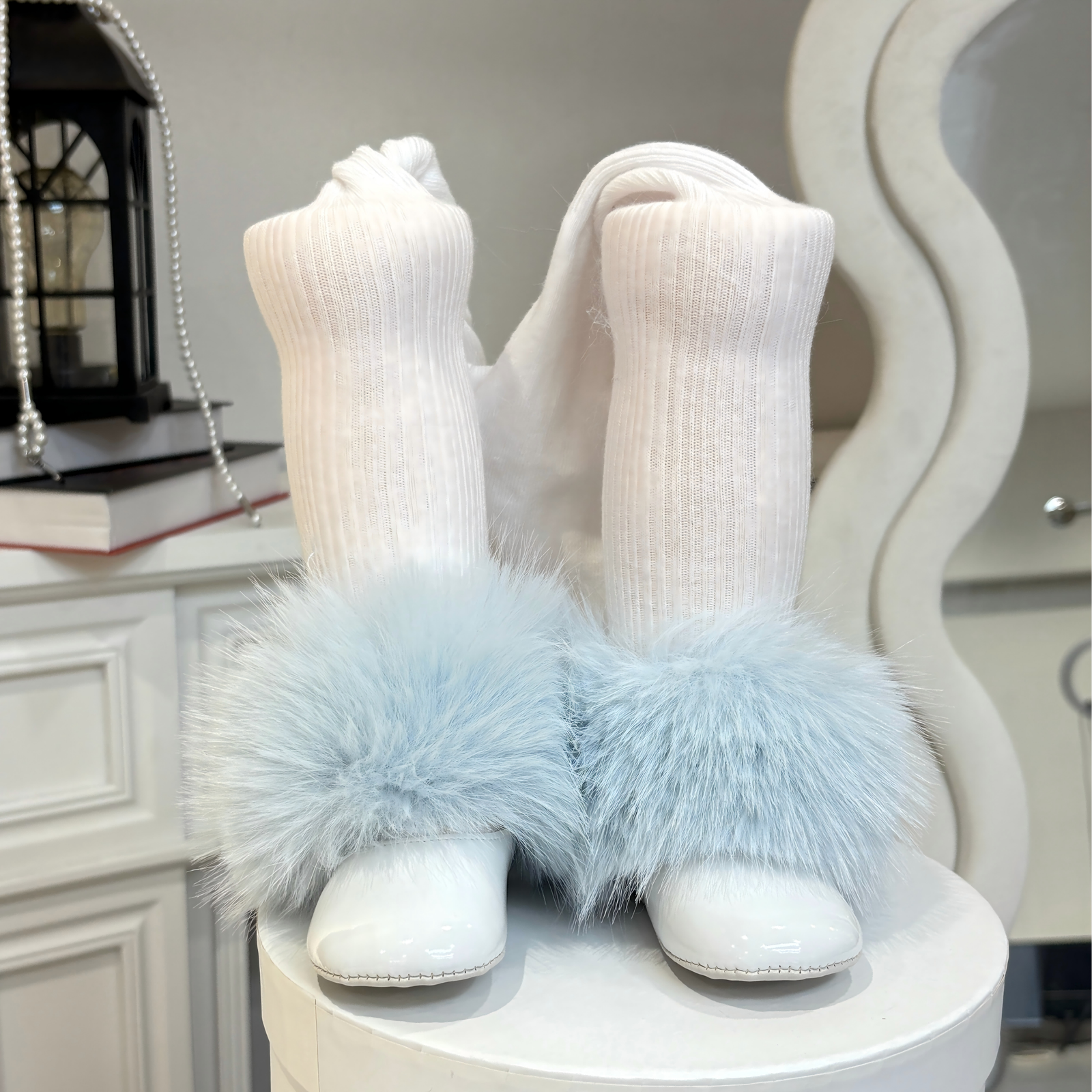 At the heart of the design lies a pair of detachable, oversized faux fur cuffs in a dreamy blush-blue hue — finished with hand-tied satin bows for a touch of fairytale charm. Fully adjustable, these statement trims can be styled above the ankle or below the knee depending on your footwear — from ballet flats to winter boots, the look is effortlessly refined.