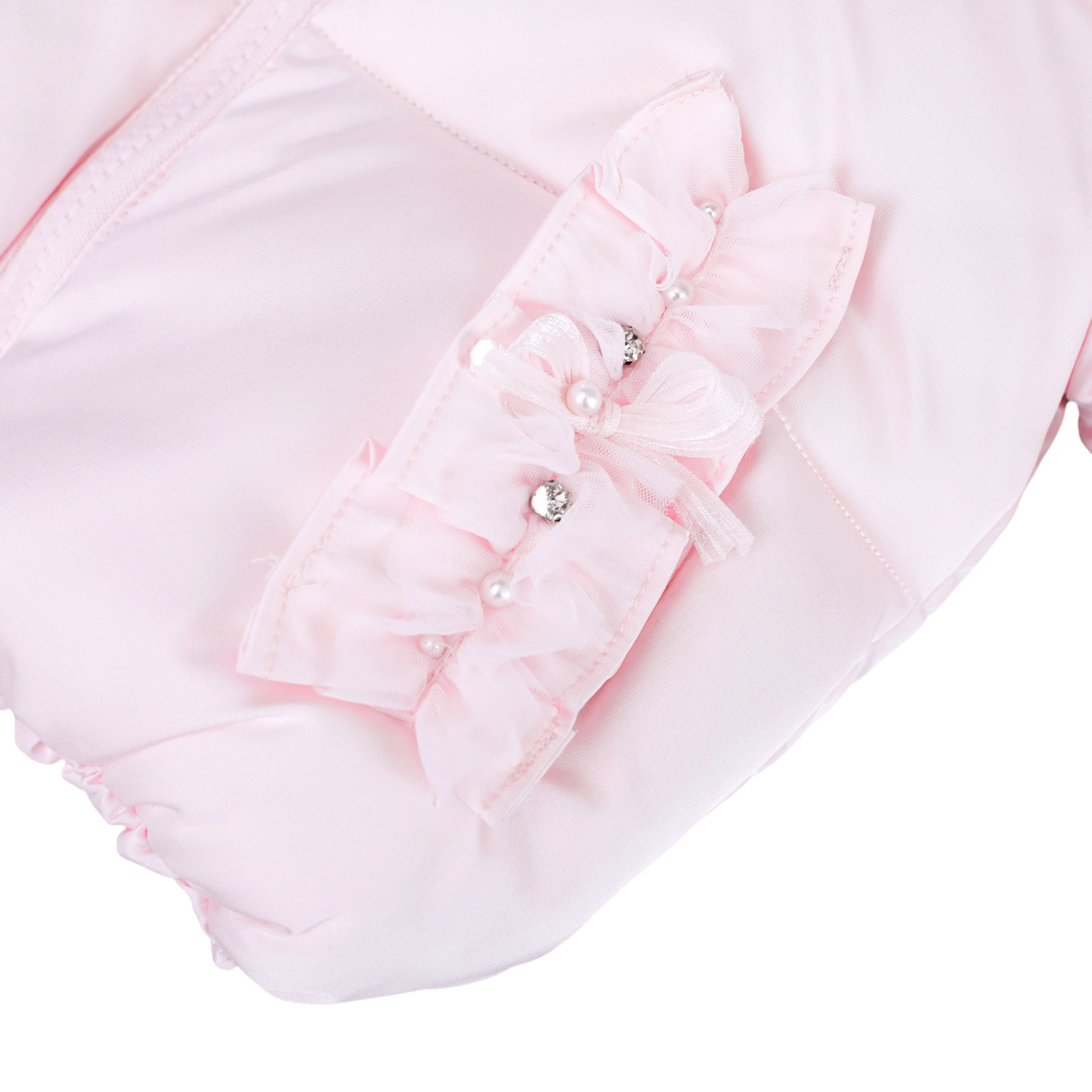 Luxury Baby Girl Baby Pink Puffer Coat with Oversized Faux Fur Hood, Satin Bow & Diamanté Pocket Details – Warm Winter Jacket EvaBella EB-9702-S