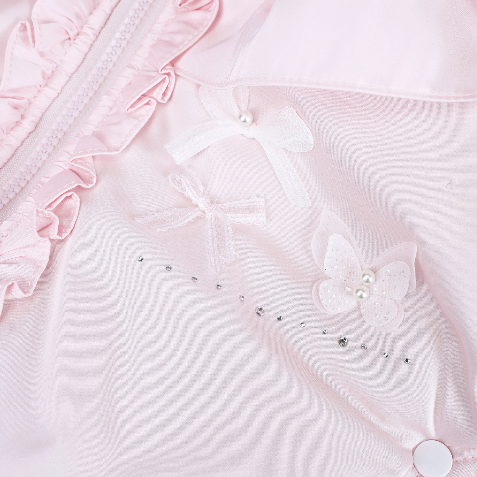 Framing the front, delicate gathered fabric trims run gracefully along each side of the zipper, while a multi-layered puffy collar beneath the hood ensures the design looks just as striking when the hood is worn up. The chest is adorned with two satin bows and a graceful butterfly, detailed with tiny pearls and diamanté accents that shimmer gently in the light.