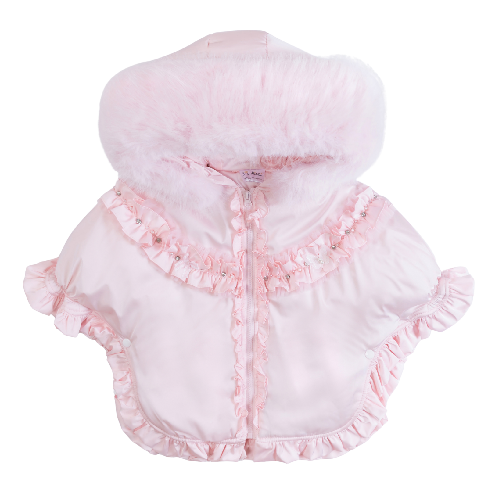 Luxury Baby Girl Puffer Cape with Oversized Faux Fur Hood, Pearl & Diamanté Tulle Chest Ruffles, Satin Bows – Warm Winter Coat EvaBella EB-9707-S