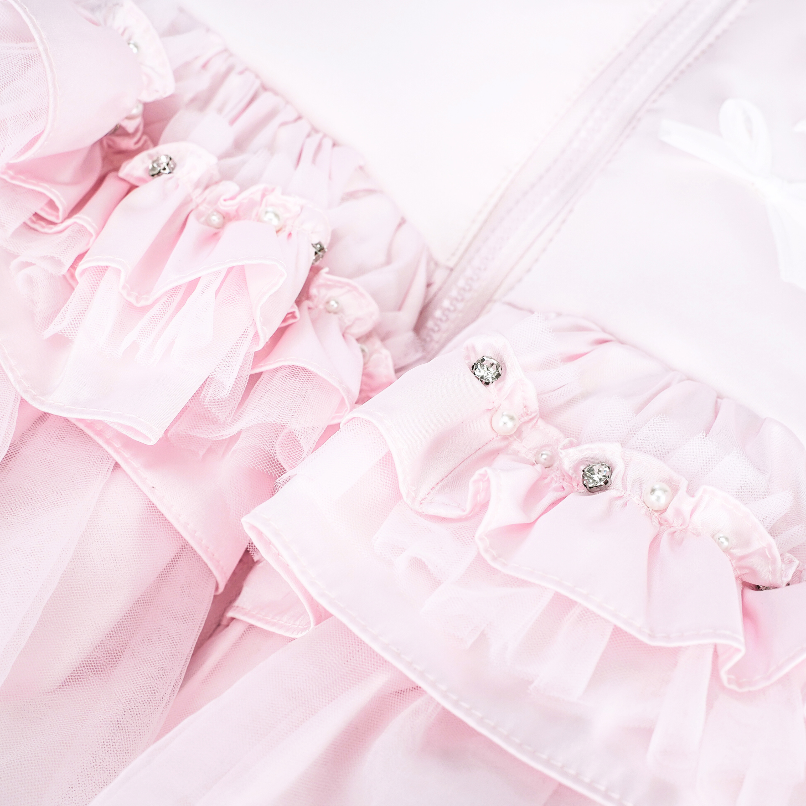A cascade of multi-layered ruffles, artfully mixed with soft tulles, creates a graceful and voluminous skirt effect. The top layer sparkles with delicate pearls and diamanté embellishments, catching the light beautifully and adding a touch of fairy-tale glamour.