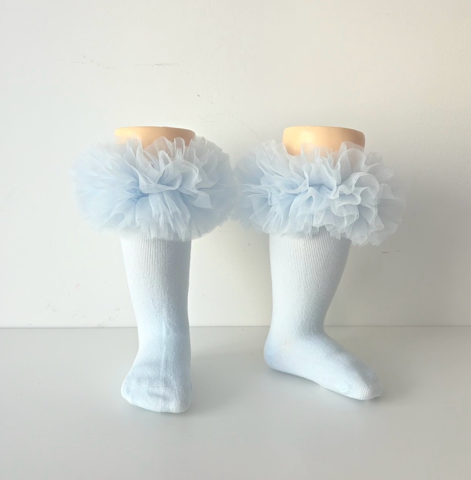EvaBella Baby Blue Tutu Socks – Tulle Ruffle Frilled Trim Knee-High Socks-Plain Knit- OEKO-TEX® Standard 100 Certified-EB-9505 Baby Blue