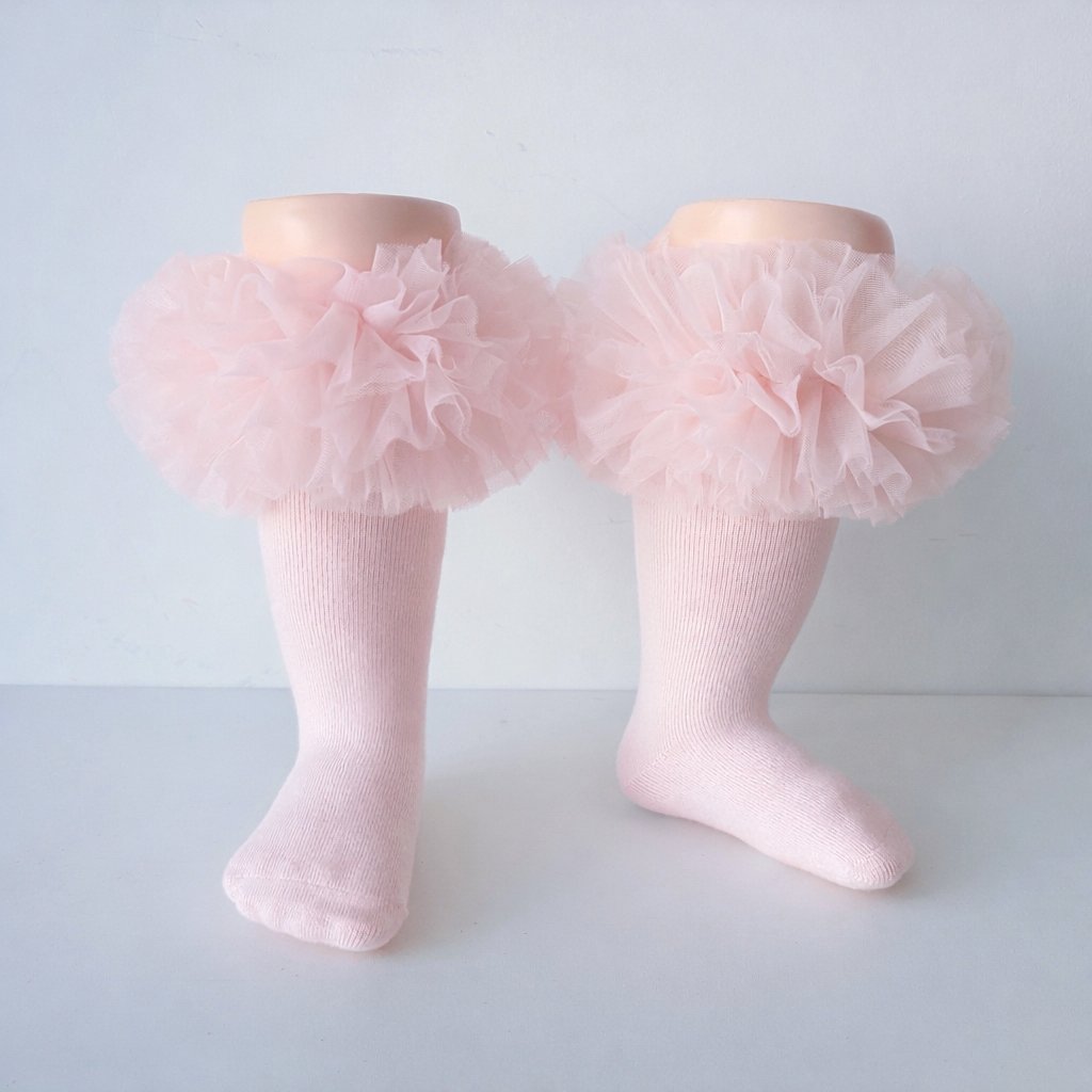 EvaBella Baby pink Tutu Socks – Tulle Ruffle Frill Trim Knee-High Socks-Plain Knit- OEKO-TEX® Standard 100 Certified-EB-9505 Baby Pink