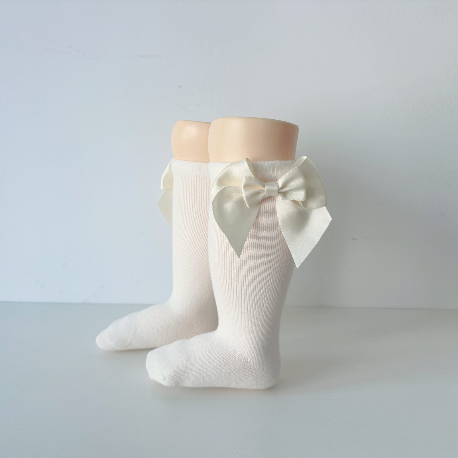 EvaBella Cream Double Satin Bow Knee-High Socks OEKO-TEX® Standard 100 Certified-EB-9506 Cream