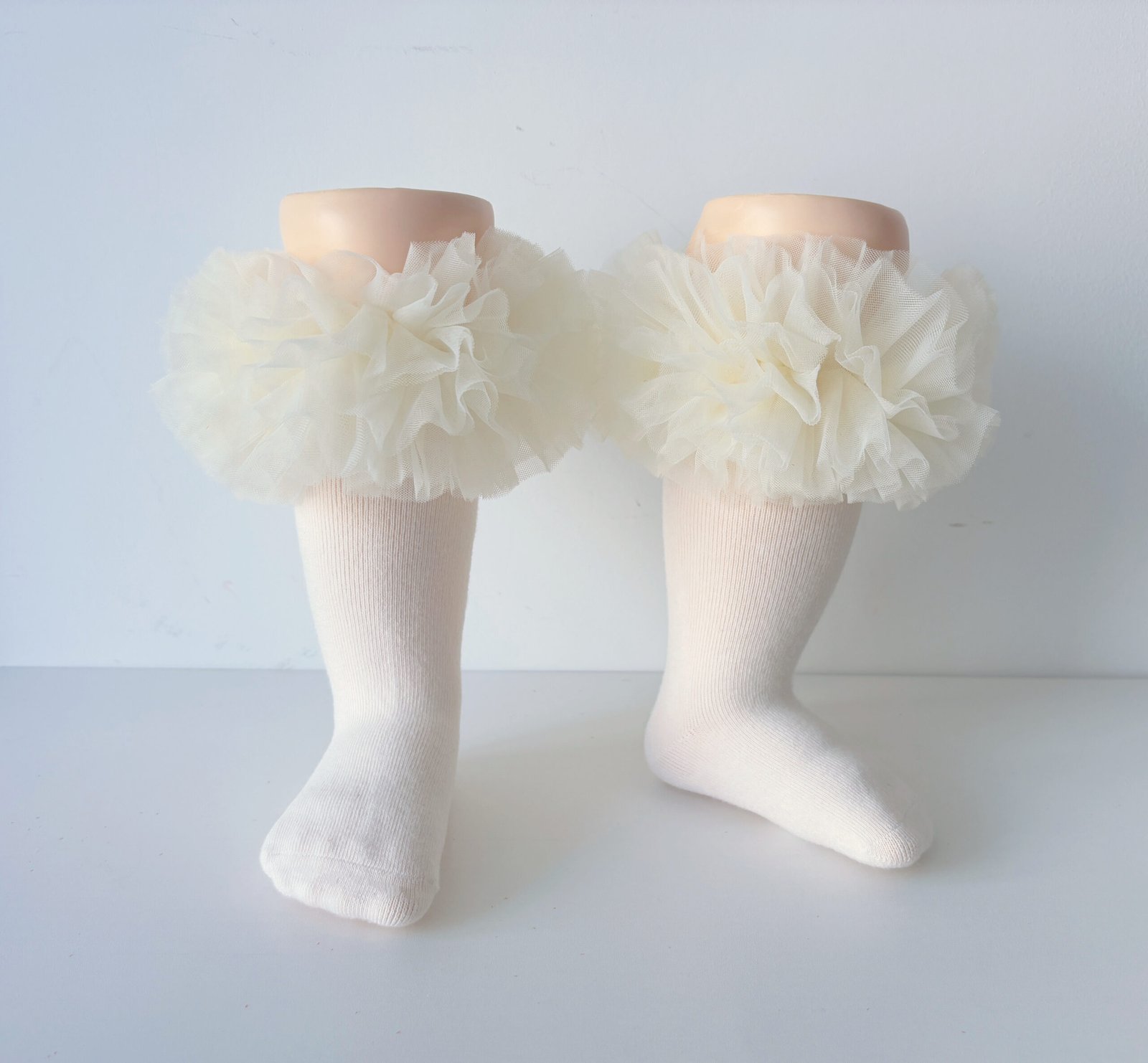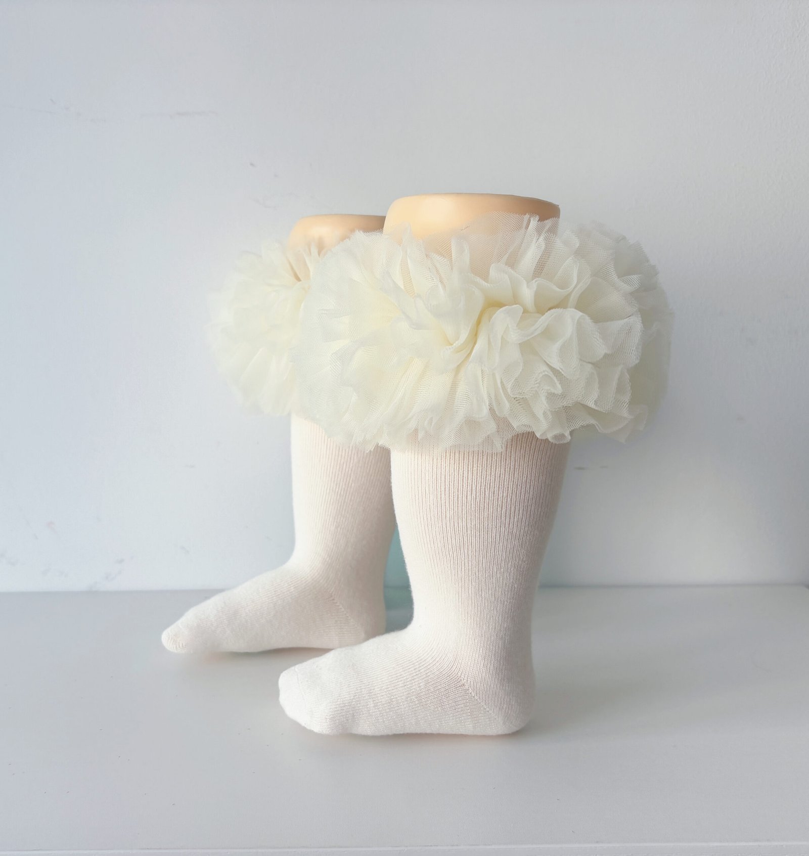 EvaBella Cream Tutu Socks – Tulle Ruffle Frilled Trim Knee-High Socks-Plain Knit- OEKO-TEX® Standard 100 Certified-EB-9505 Cream
