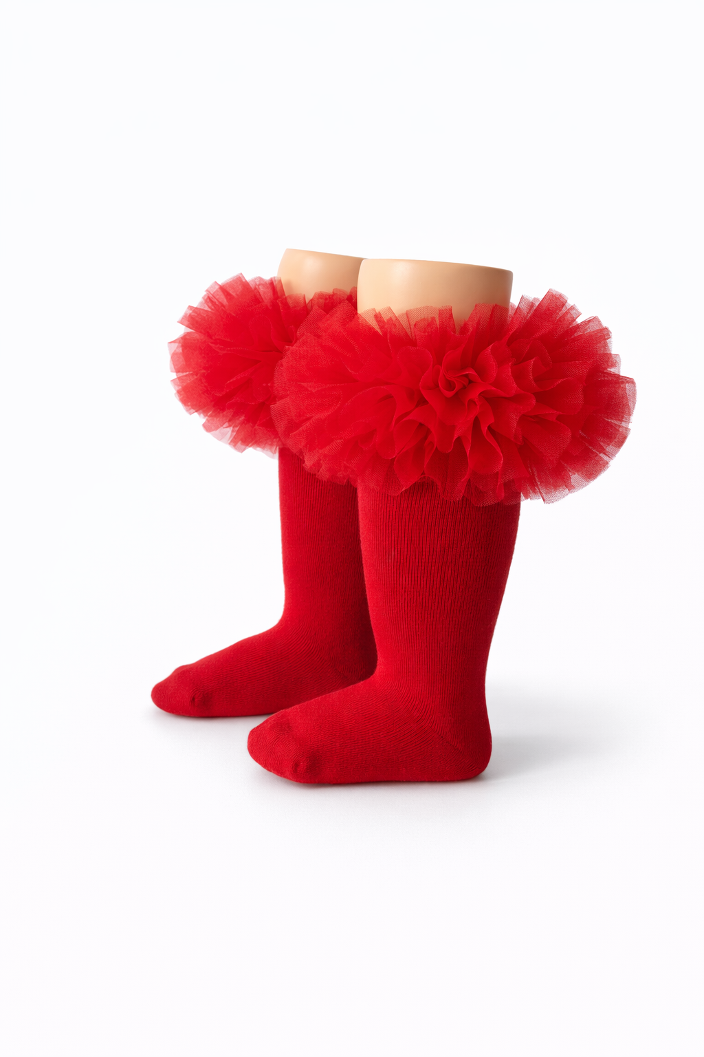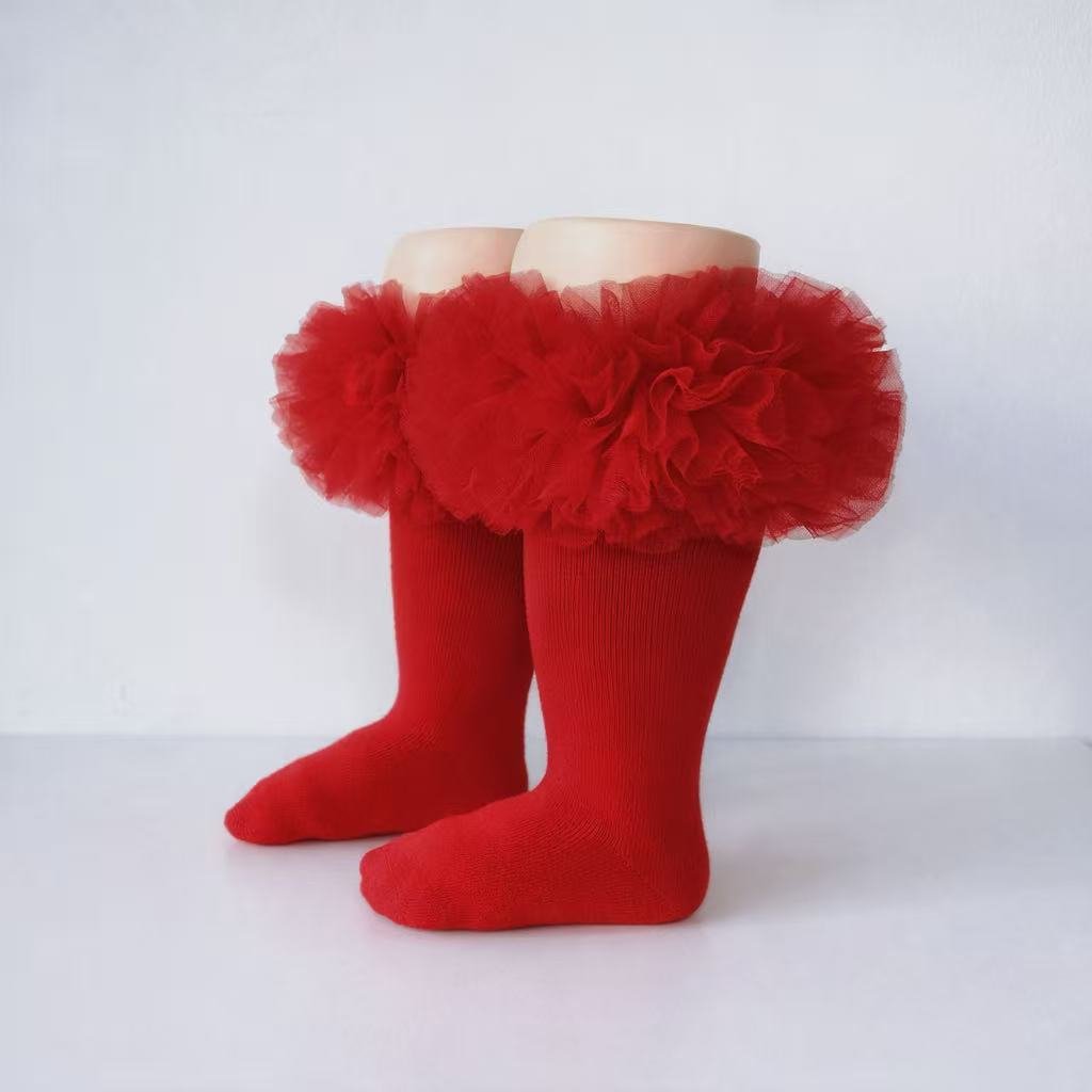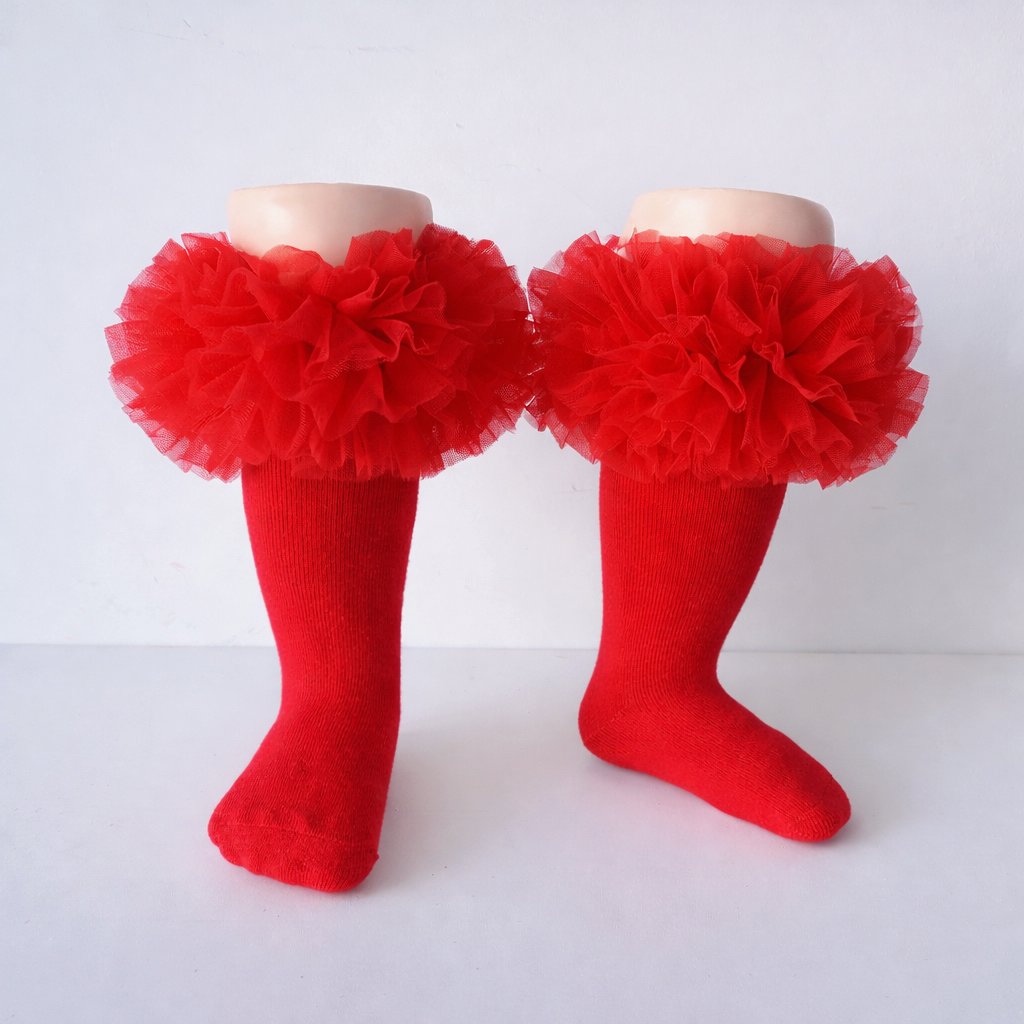 EvaBella Red Tutu Socks – Tulle Ruffle Frilled Trim Knee-High Socks-Plain Knit- OEKO-TEX® Standard 100 Certified-EB-9505 Red