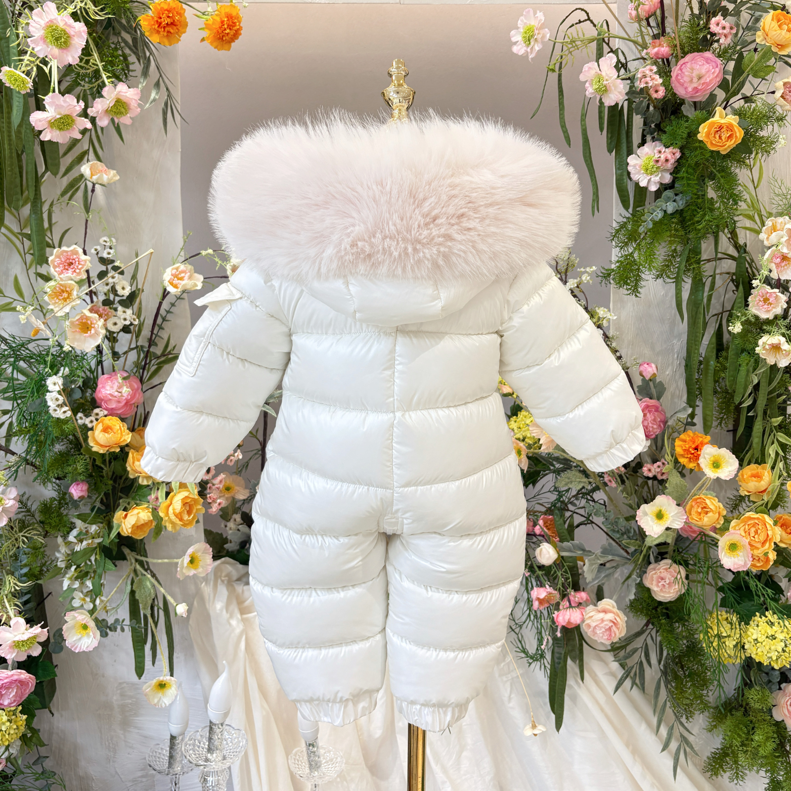 Finished with a plush faux fur pompom at the waist for a signature EvaBella touch, this gender-neutral snowsuit is equally suited for snowy strolls, winter holidays, or stylish everyday wear.