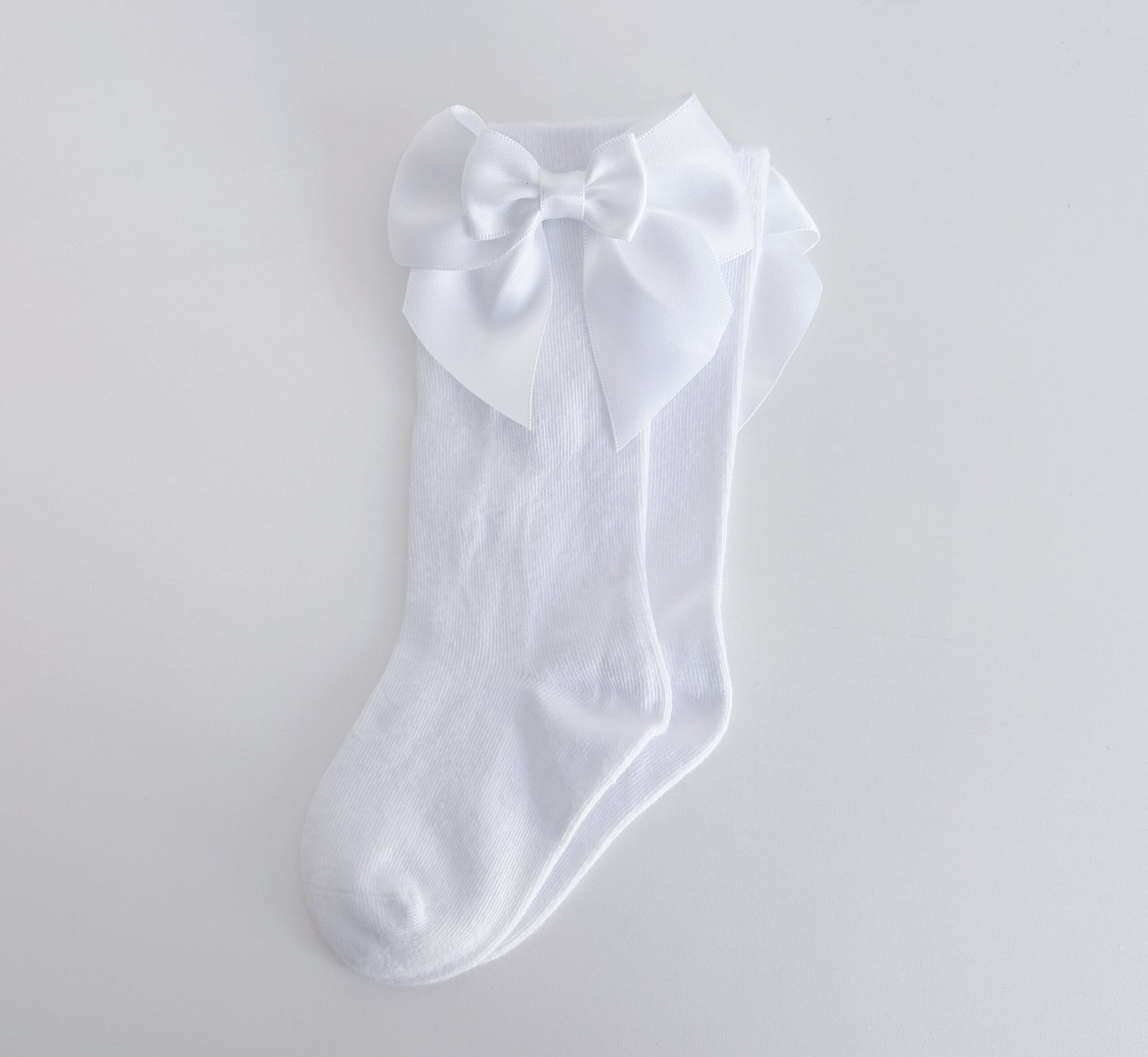 EvaBella White Double Satin Bow Knee-High Socks OEKO-TEX® Standard 100 Certified-EB-9506 White