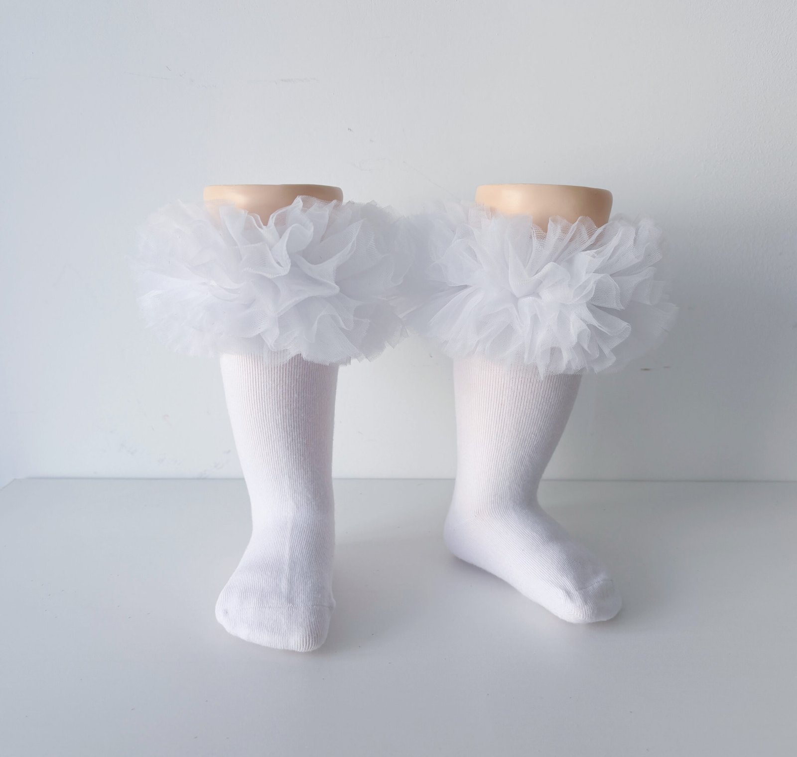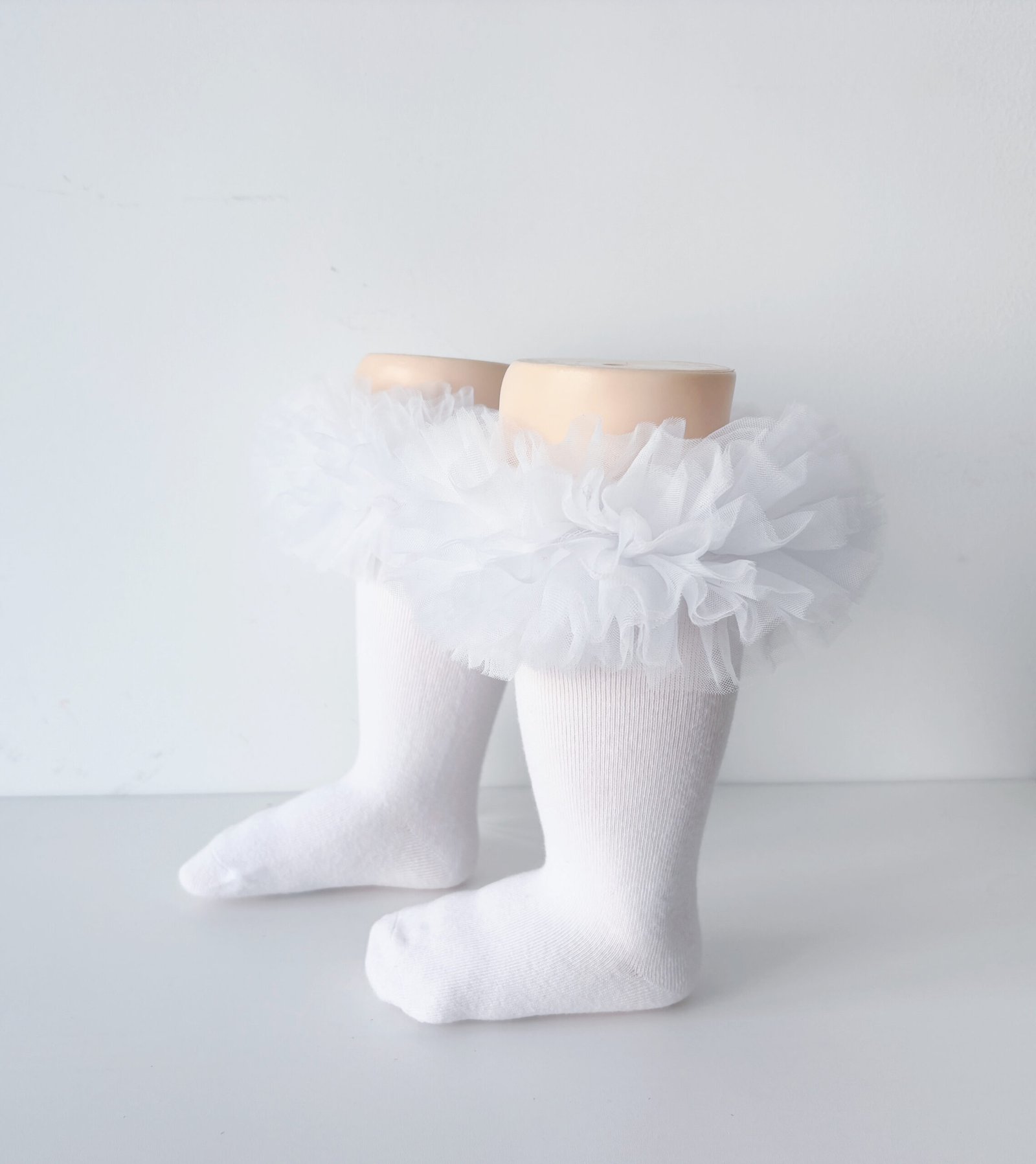 EvaBella White Tutu Socks – Tulle Ruffle Frilled Trim Knee-High Socks-Plain Knit- OEKO-TEX® Standard 100 Certified-EB-9505 White