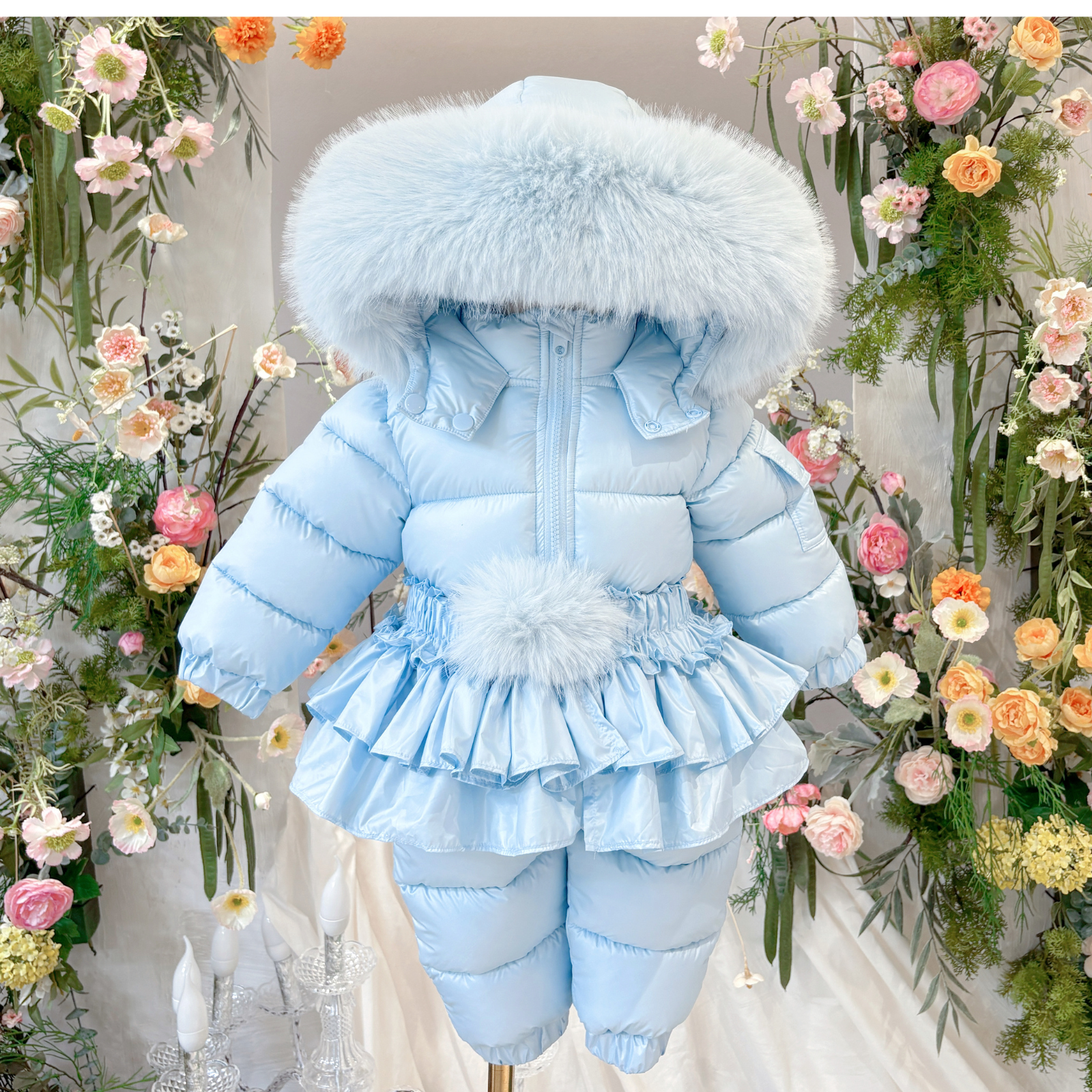 | EvaBella Signature Winter Snowsuit with Detachable Skirt-EB-9803–BabyBlue | Signature Oversized Faux Fur Hood – Luxuriously soft and detachable for versatility and ease of care. Frames the face beautifully with a cloud-like blush trim.