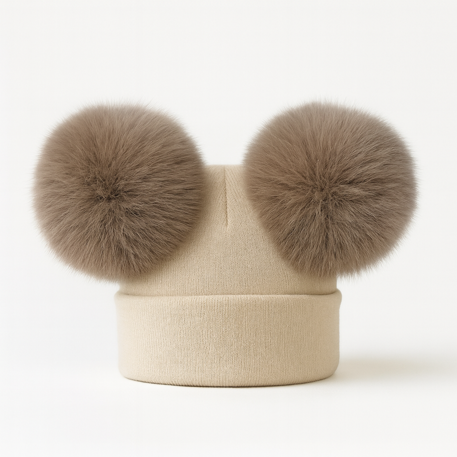 | Double Pompom Hat -Cream Baby Hat with 2 Cream Fluffy Mega Pompoms EB-H-05C | Two mega-fluffy pompoms for a playful, standout look