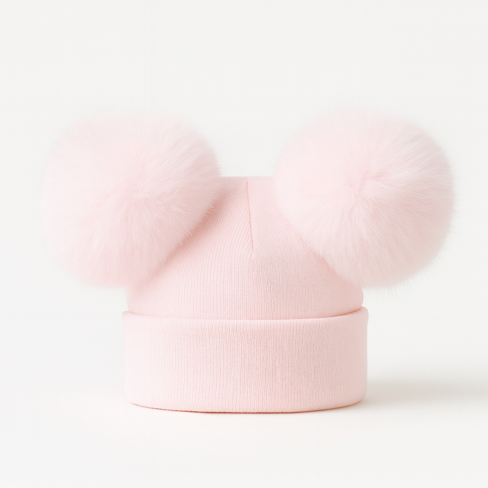 | Double Pompom Hat -BabyPink Baby Hat with 2 BabyPink Fluffy Mega Pompoms EB-H-05P | Two mega-fluffy pompoms for a playful, standout look